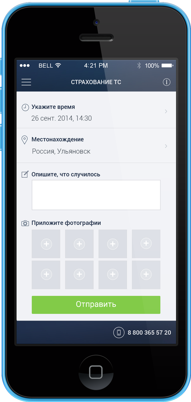В стрессовой ситуации человеку сложно сосредоточится и выполнить большое количество последовательных манипуляций, поэтому мы составили простейший набор полей и предоставили пользователю возможность сообщить о произошедшем страховом случае с главного экрана приложения