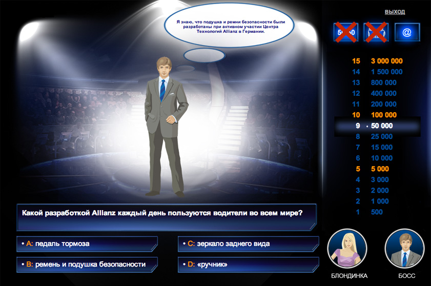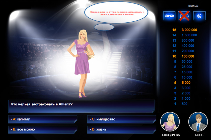 Создать корпоративную игру «Миллионер» для будущих сотрудников компании Allianz.