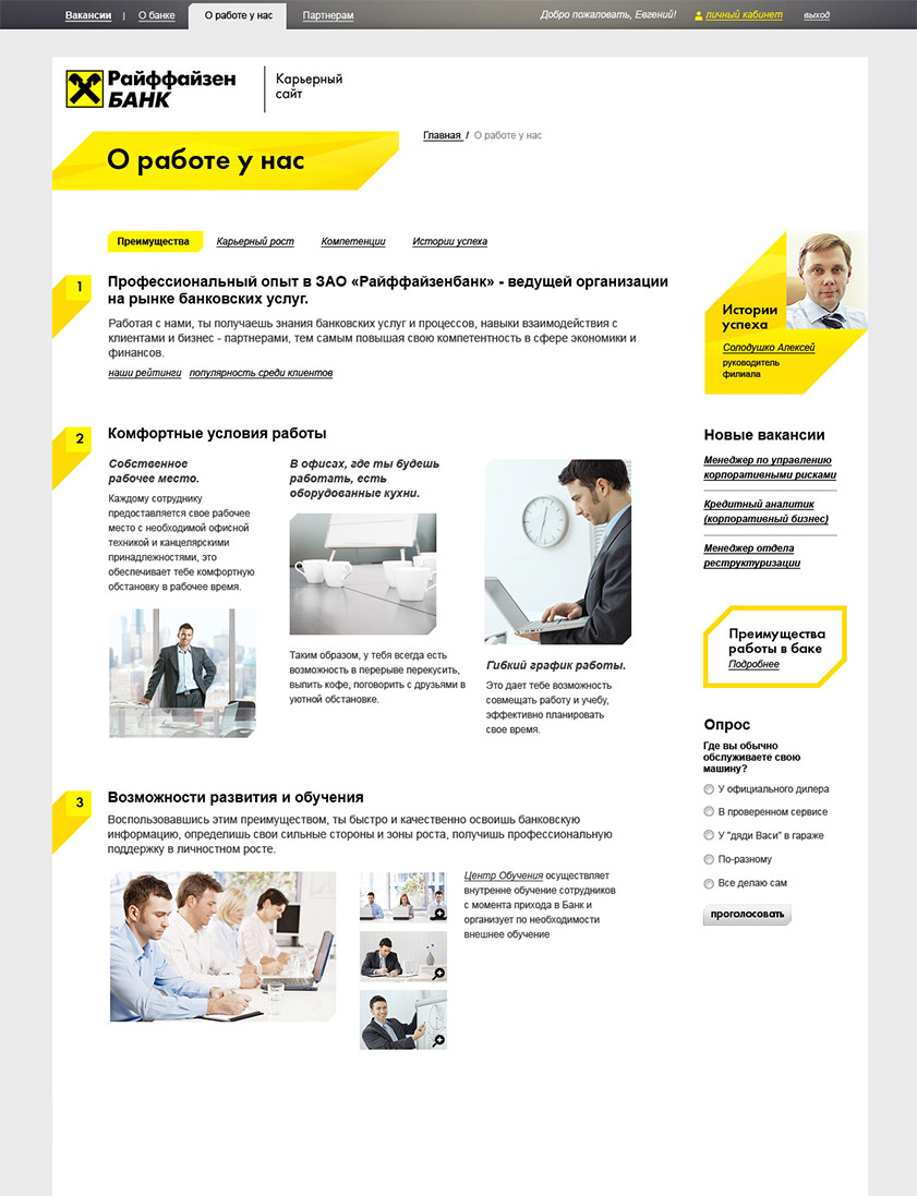 В разделе «О работе у нас» можно ознакомиться со всей необходимой соискателю информацией о банке и условиях работы. Во вкладке «Карьерный рост» визуализирована схема карьерного роста внутри отделения банка.
