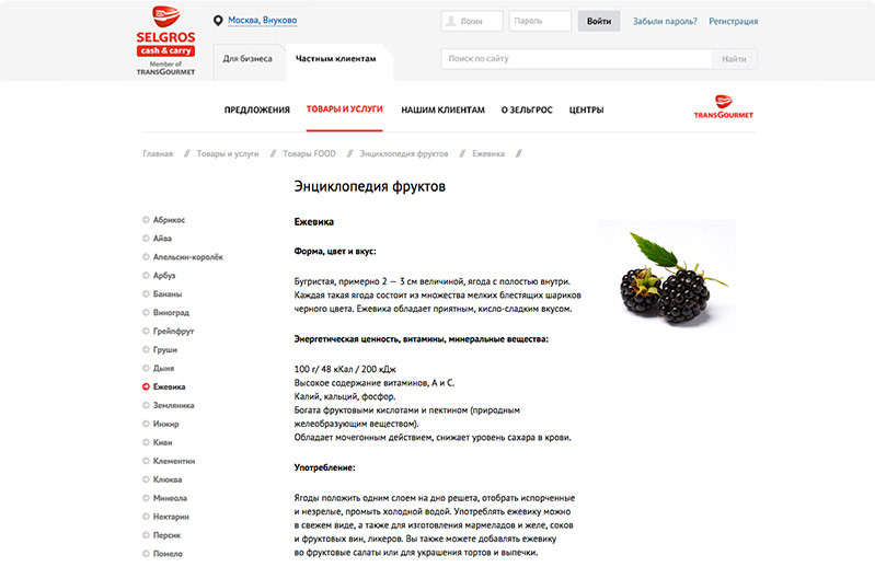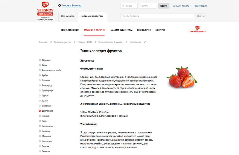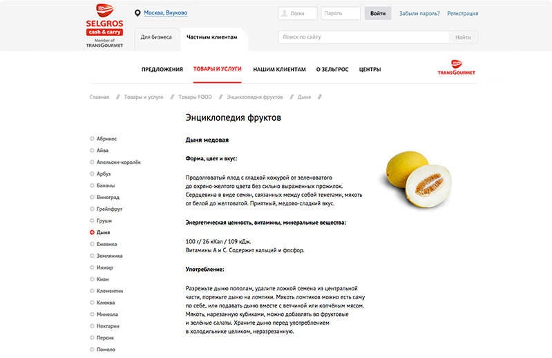 Одна из главных задач нового сайта — подробно рассказать о продуктах, которые представлены в ассортименте гипермаркета. Например, для привлечения большего внимания к товарной категории «Фрукты» на сайте реализован информационный сервис «Энциклопедия фруктов»: каждый фрукт, продающийся в магазине, имеет продуктовую карточку с информацией о его полезных свойствах и способах применения. Так клиенты узнают, какие блюда можно приготовить из ежевики, с чем едят сацуму и какие полезные свойства у айвы. В дальнейшем планируется разработка подобных сервисов для других типов продуктов — мясо и бакалея.