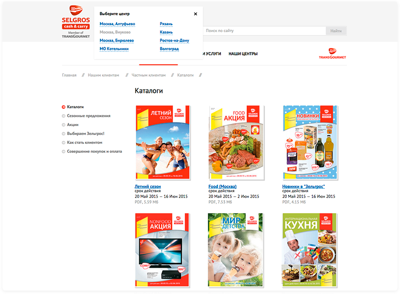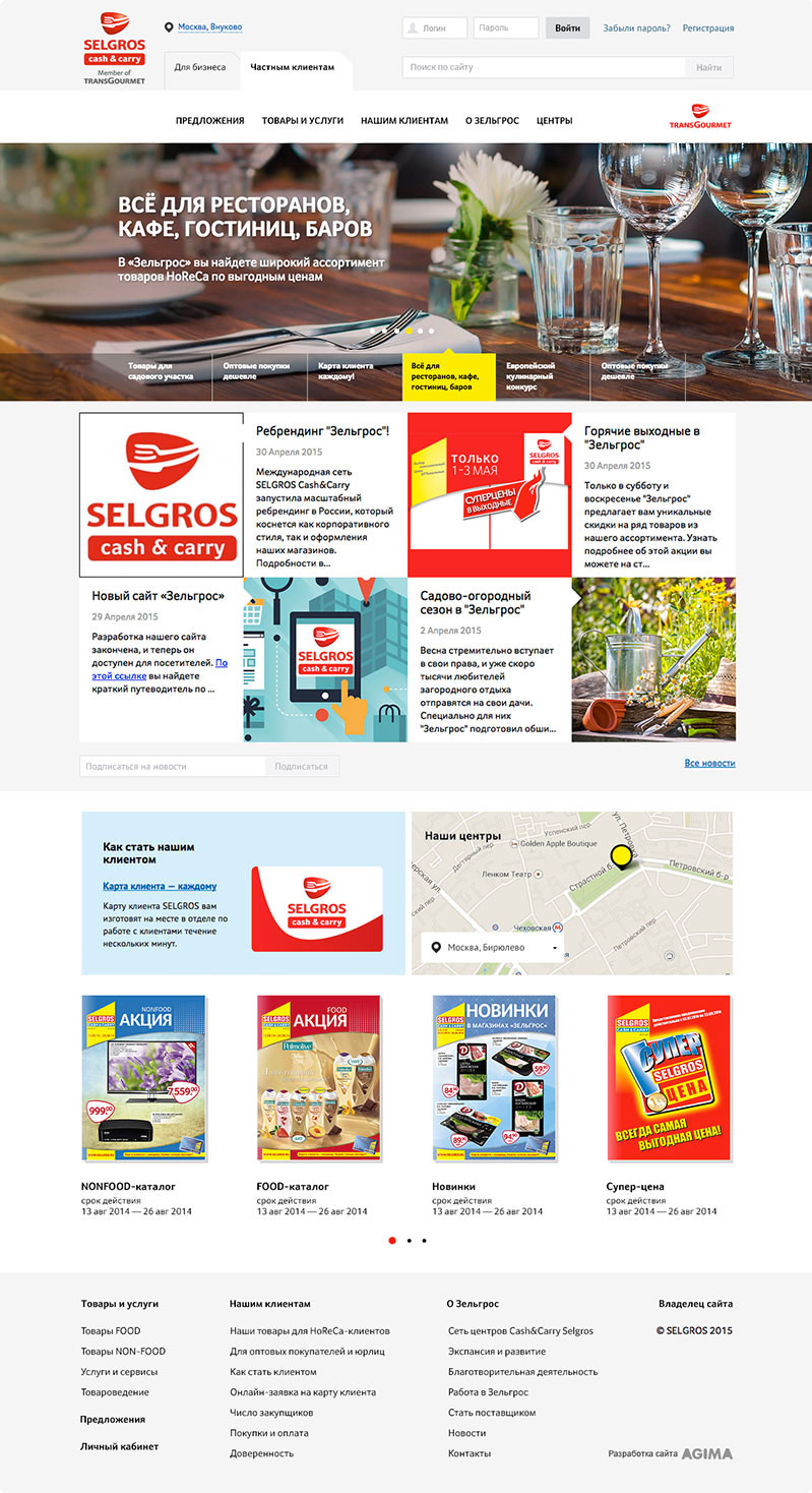 Магазины формата Cash&Carry пользуются большим спросом среди корпоративных клиентов, поэтому сайт разделен на два раздела: для бизнеса и для частных клиентов. Новости компании, информация об акциях, а также каталоги, которые можно полистать прямо на сайте или сохранить в формате PDF — для каждой аудитории выводится уникальная информация.